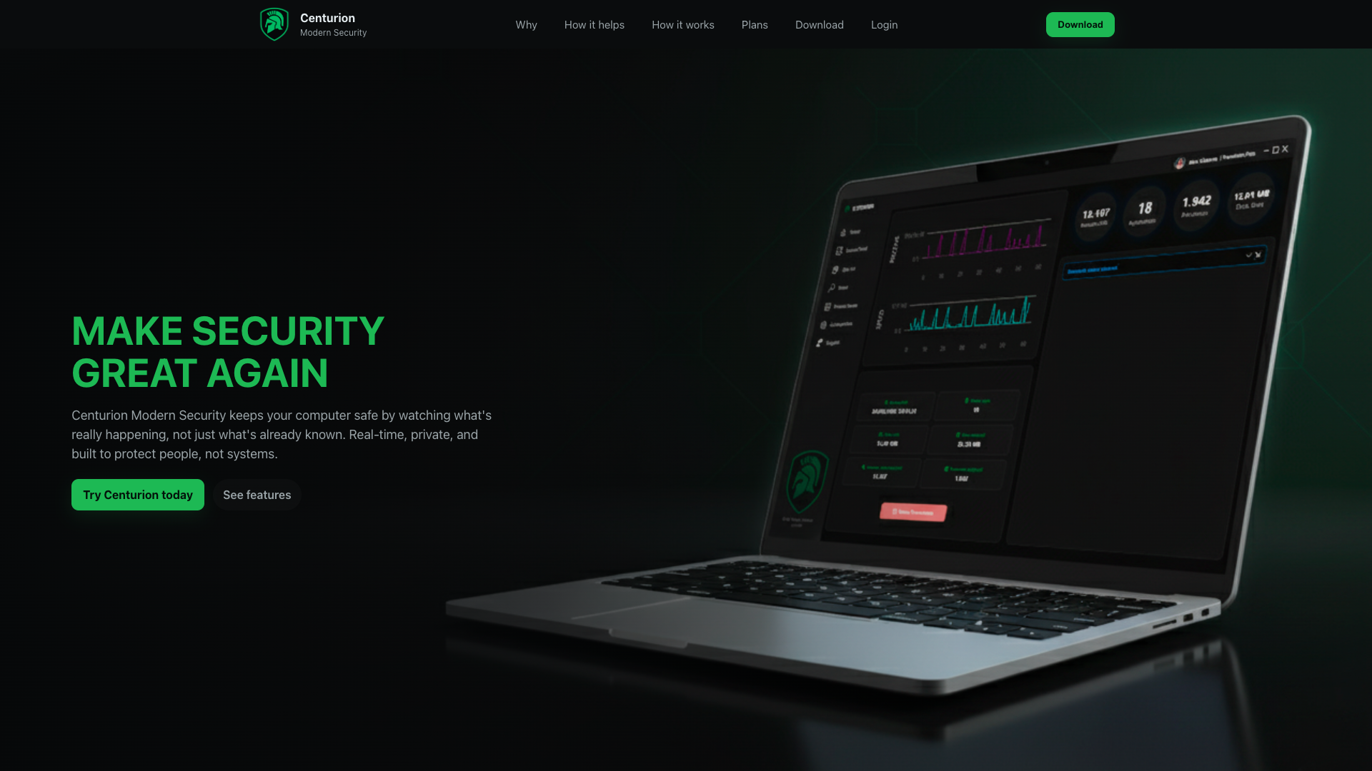 Centurion Modern Security - Real-time, local-first protectionCenturion Modern Security. Real-time, local-first cybersecurity to individuals. Analyze connections and protect against hacks with behavioral precision.