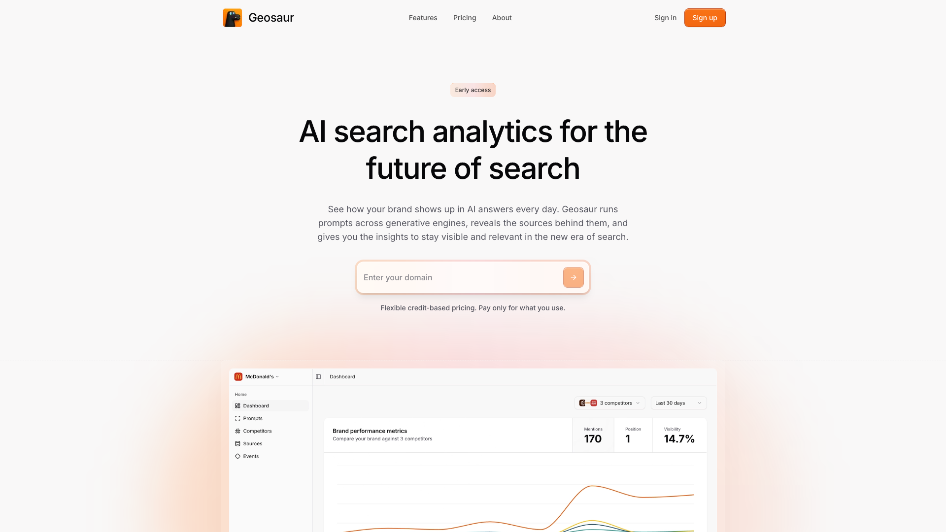 Geosaur - AI search analytics for the future of searchSee how your brand shows up in AI answers every day. Geosaur runs prompts across generative engines, reveals the sources behind them, and gives you the insights to stay visible and relevant in the new era of search.