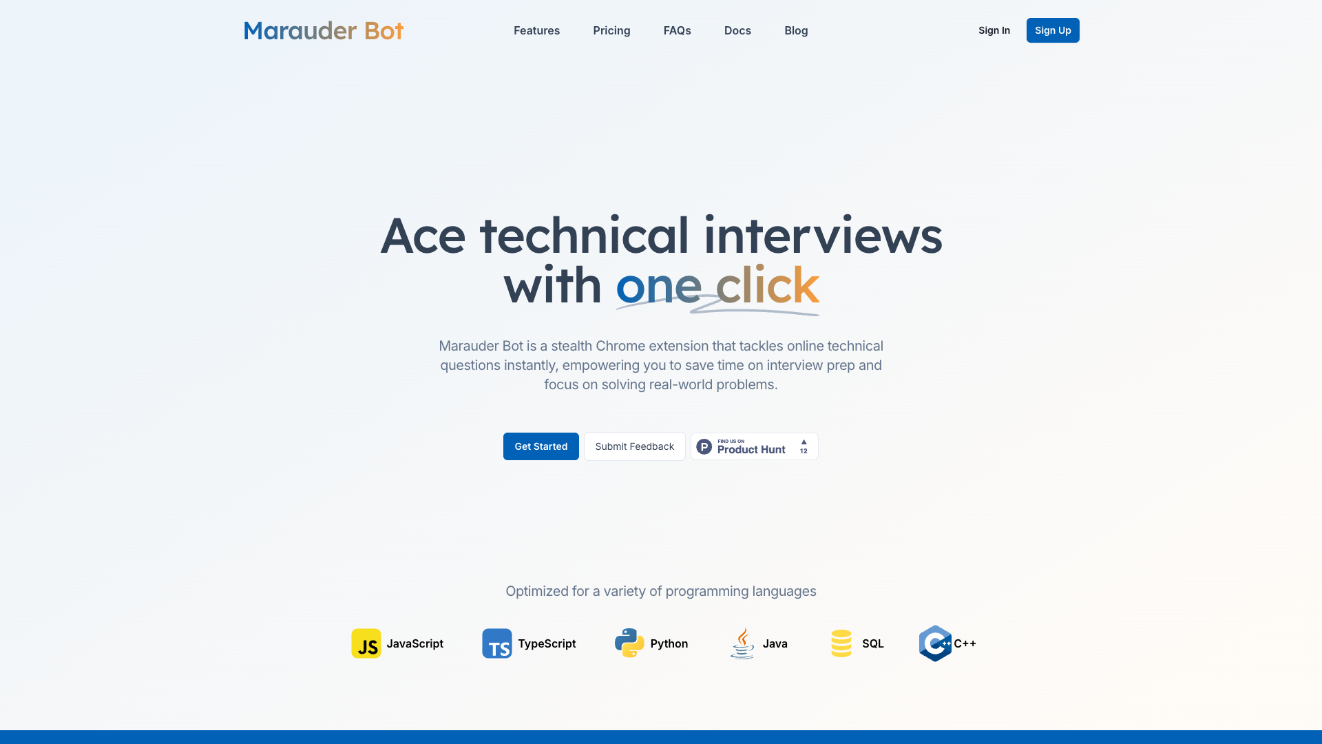 Solve technical challenges with one click. Marauder Bot is an AI copilot for online technical questions. Get fast feedback on your code and improve your problem-solving skills.