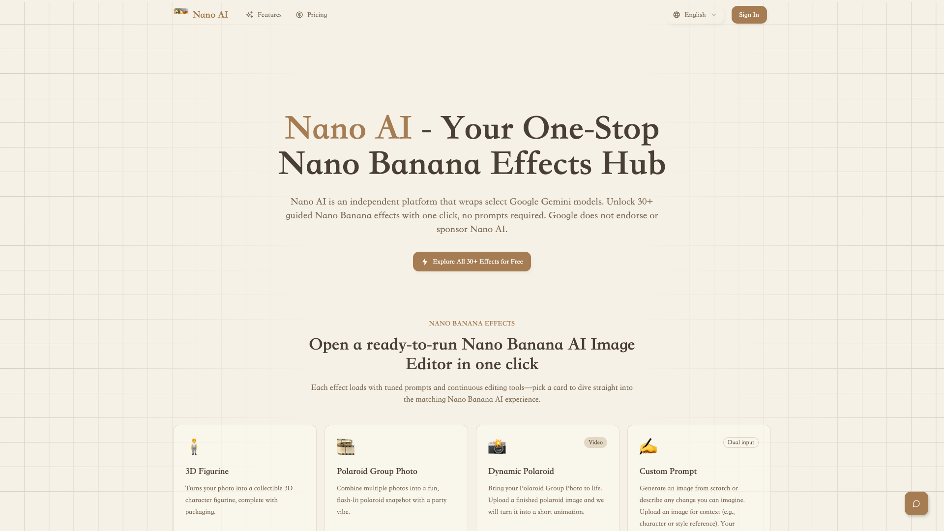 Nano AI - Best All-in-One Nano Banana AI Image Editor 2025Experience 30+ Nano Banana effects in one AI image editor. Such as 3D figurines, and edit continuously with one click. No prompts needed. Try Nano AI for free!