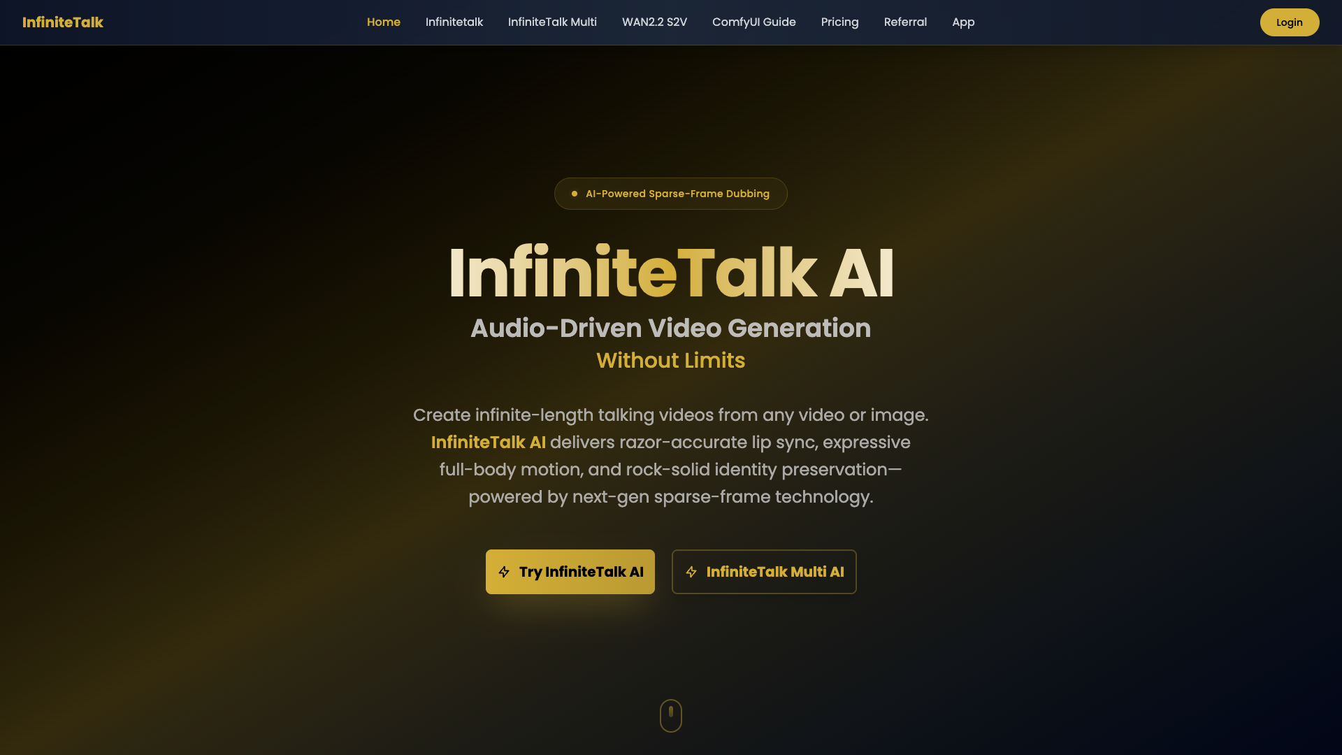 InfiniteTalk AI | Sparse-Frame, Audio-Driven Video DubbingInfiniteTalk AI: audio-driven full-body video dubbing that preserves identity and camera motion, with sparse-frame control and long-sequence image-to-video.