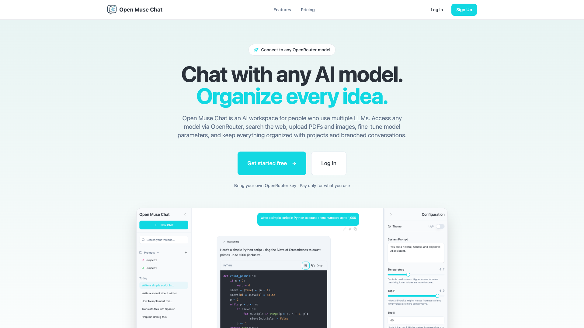 Advanced AI chat application with support for multiple LLMs, customizable parameters, web search integration, and file attachments.