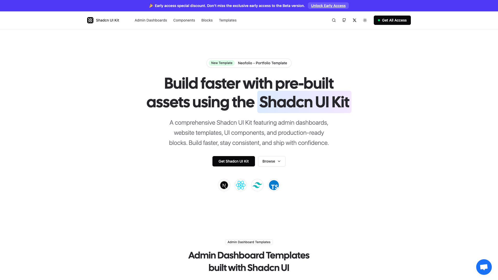 Shadcn UI Kit: Admin Dashboards, UI Blocks, Components & Website TemplatesShadcn UI Kit is a collection of admin dashboards, website templates, components, UI blocks and Figma UI kit. Built with Tailwind CSS and React. It helps save time by minimizing development time.