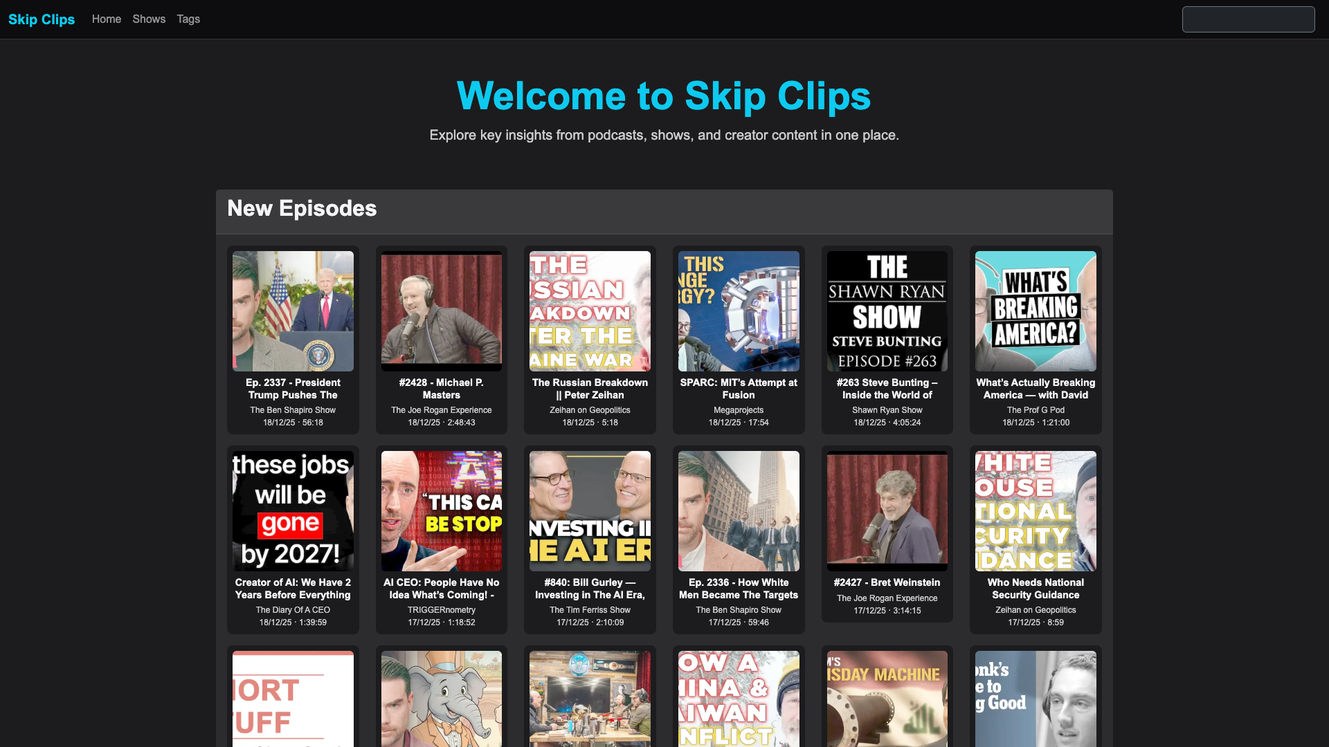 Explore videos from podcasts, shows, and creators with summaries, topic tags, and analysis. Track guests to quickly find the content and ideas that matter..